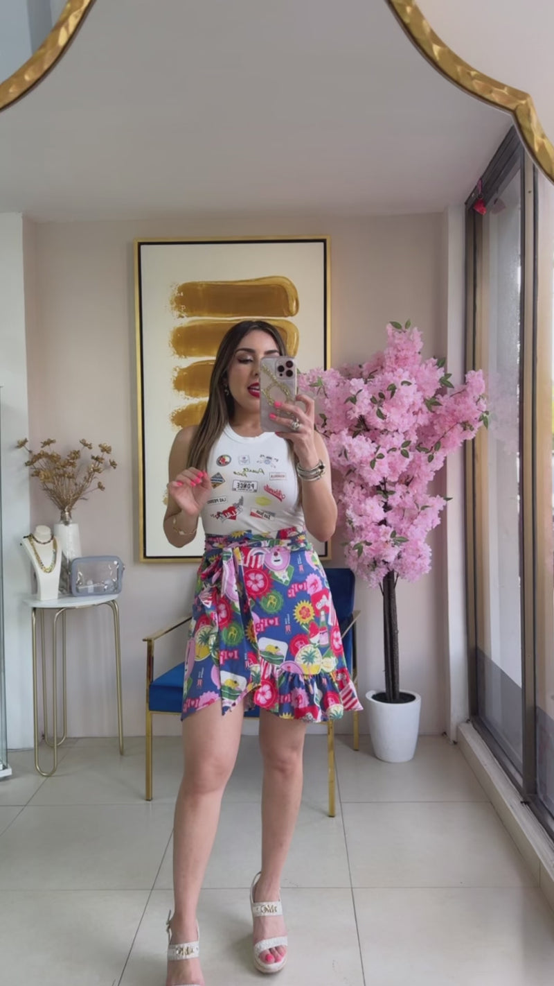 Estampas de Puerto Rico wraparound skirt. Model wearing S/M. Deben pagar el costo de envío de $7.75.