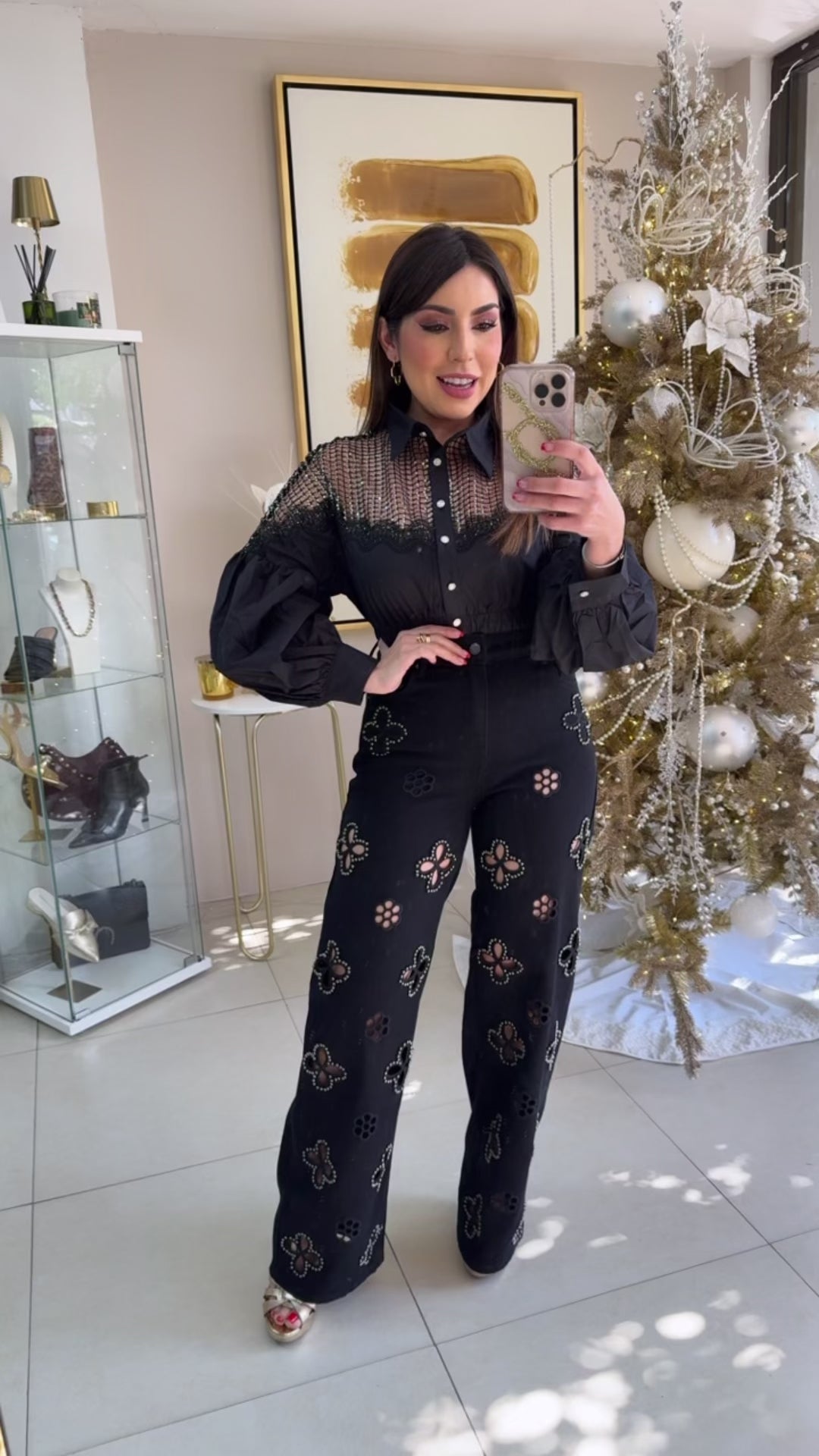 Black Pearls Flowers Jeans. Model wearing Small.