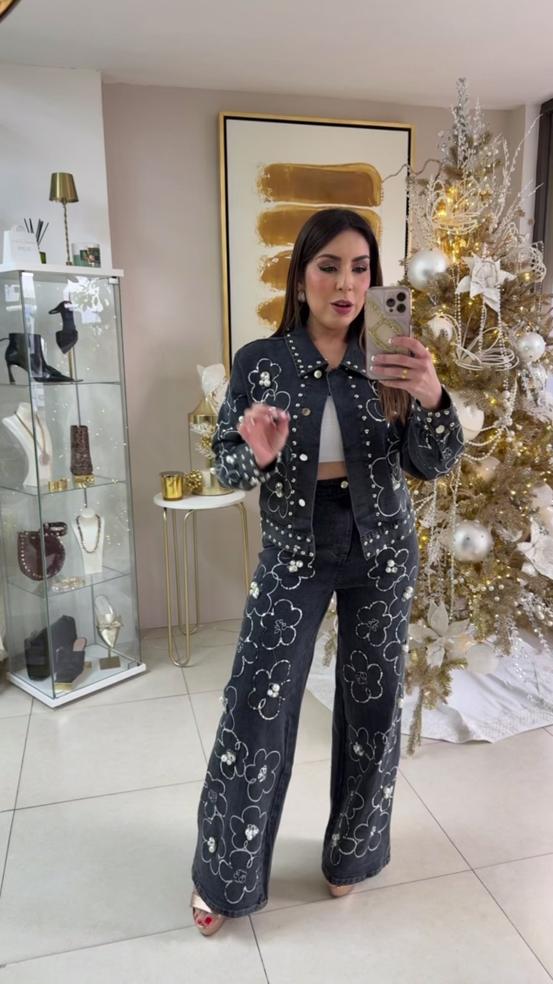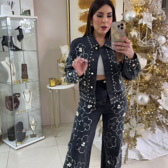 Dark Denim Pant and Top Set. Sequins, Pearls and flower details. wearing Small.