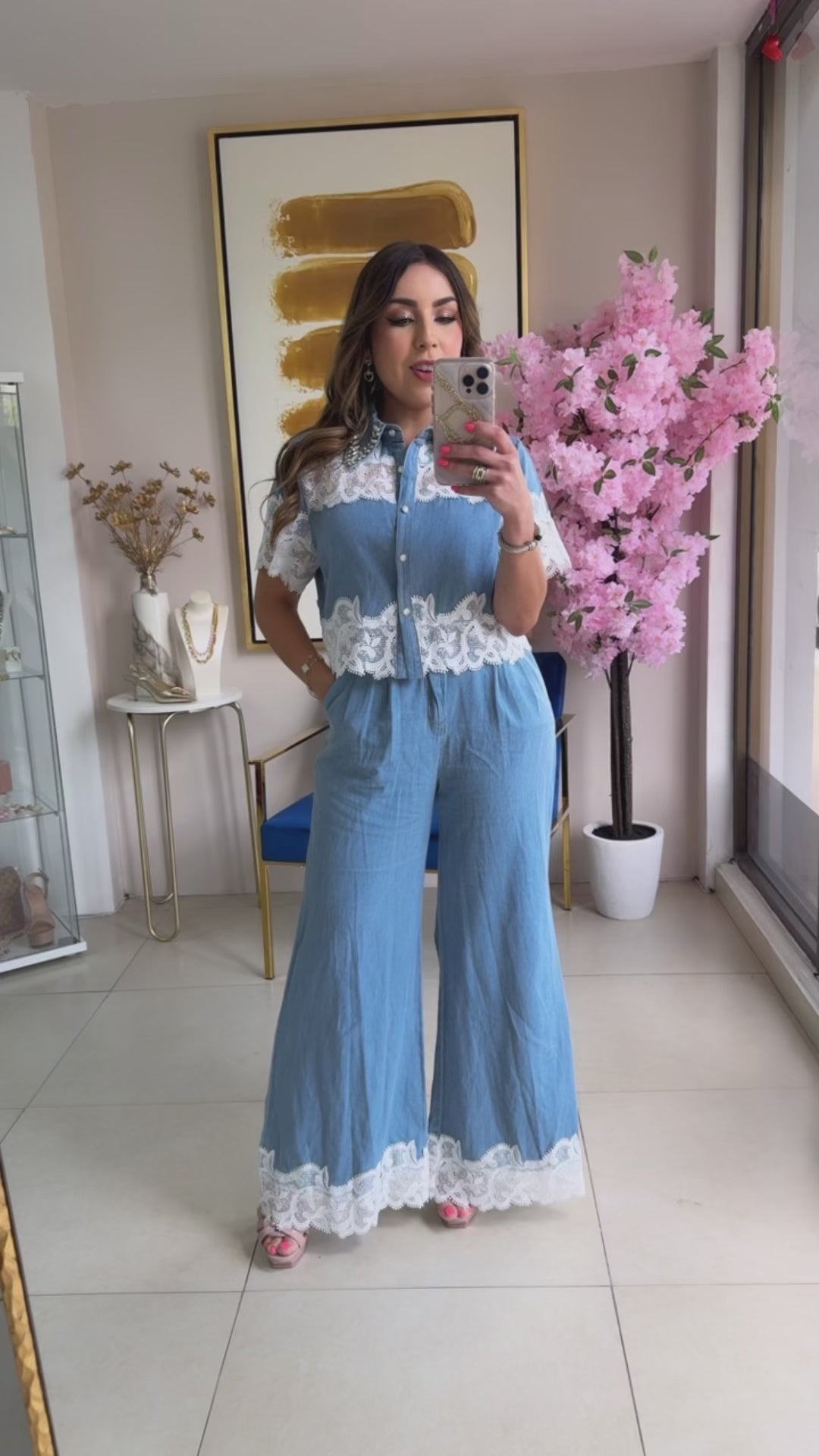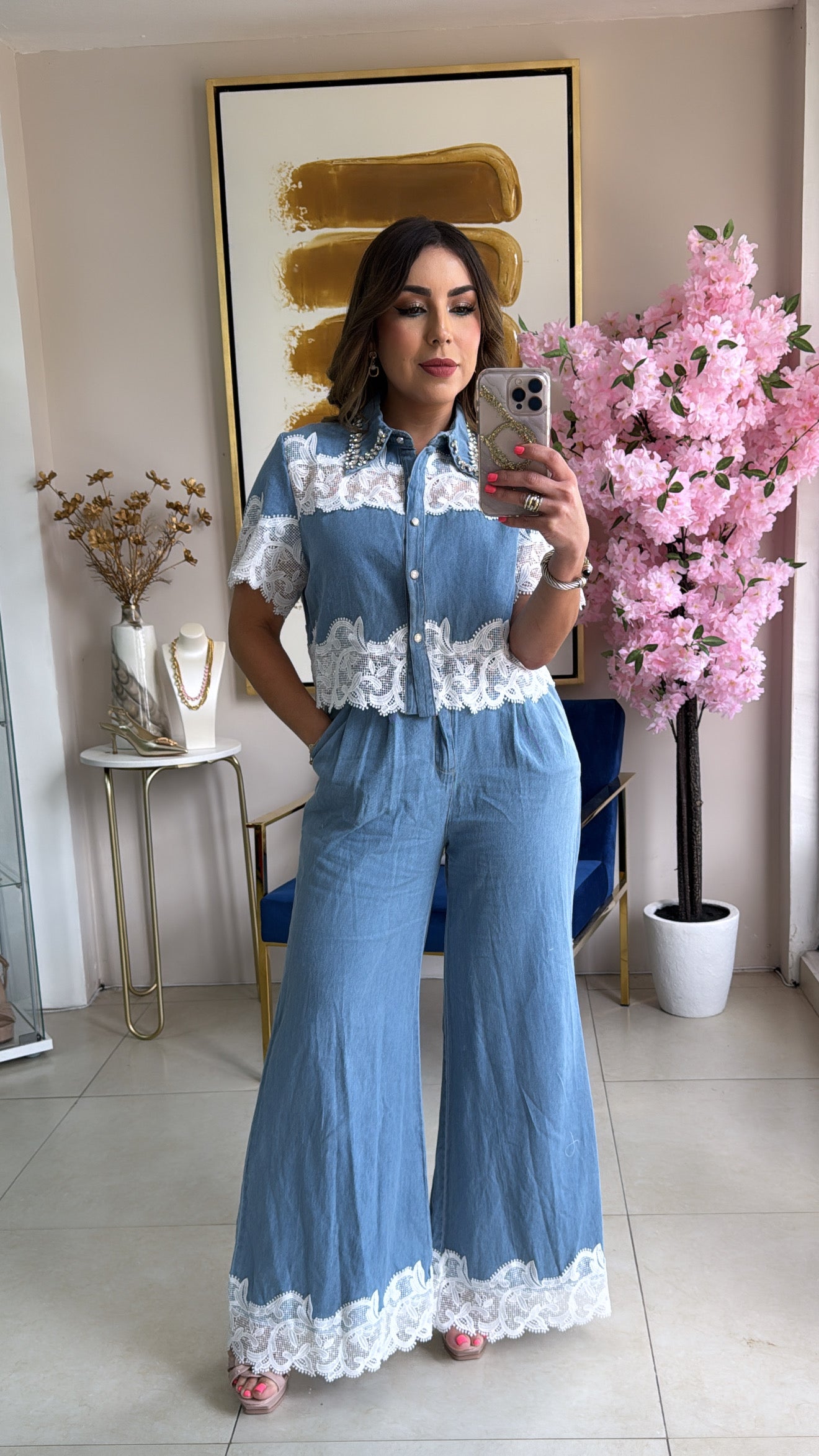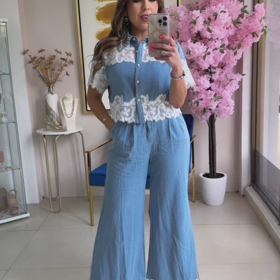 Denim & Lace Pant Set. Lace detail. Side pockets on pants. Model wearing Small. Stretch.
