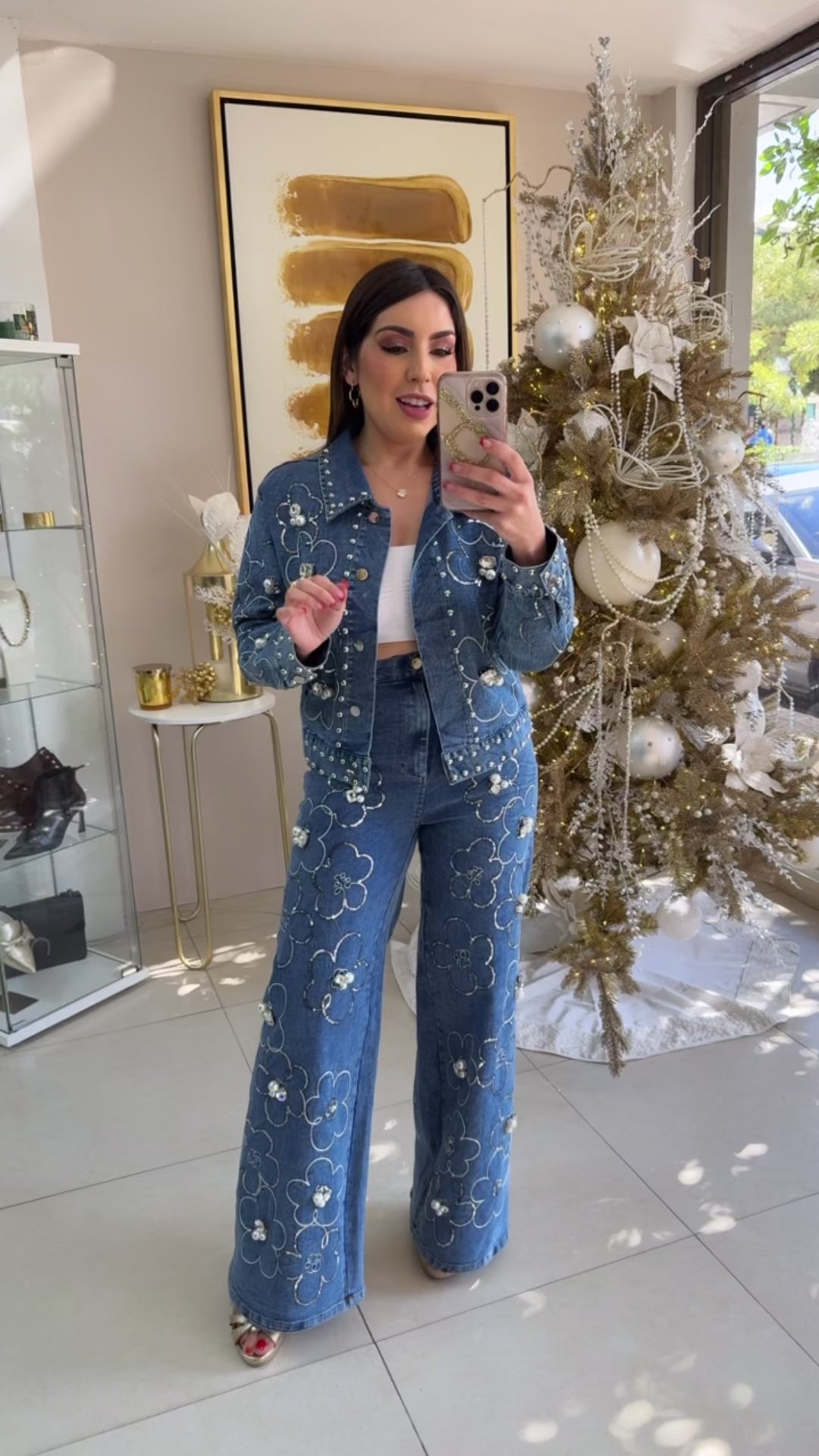 Denim Pant and Top Set. Sequins, Pearls and flower details. wearing Small.