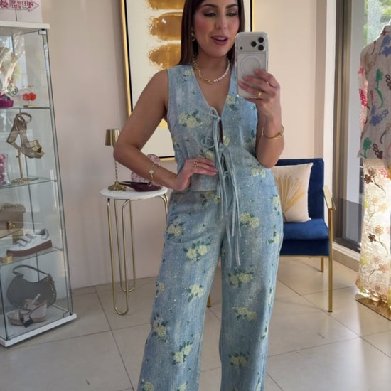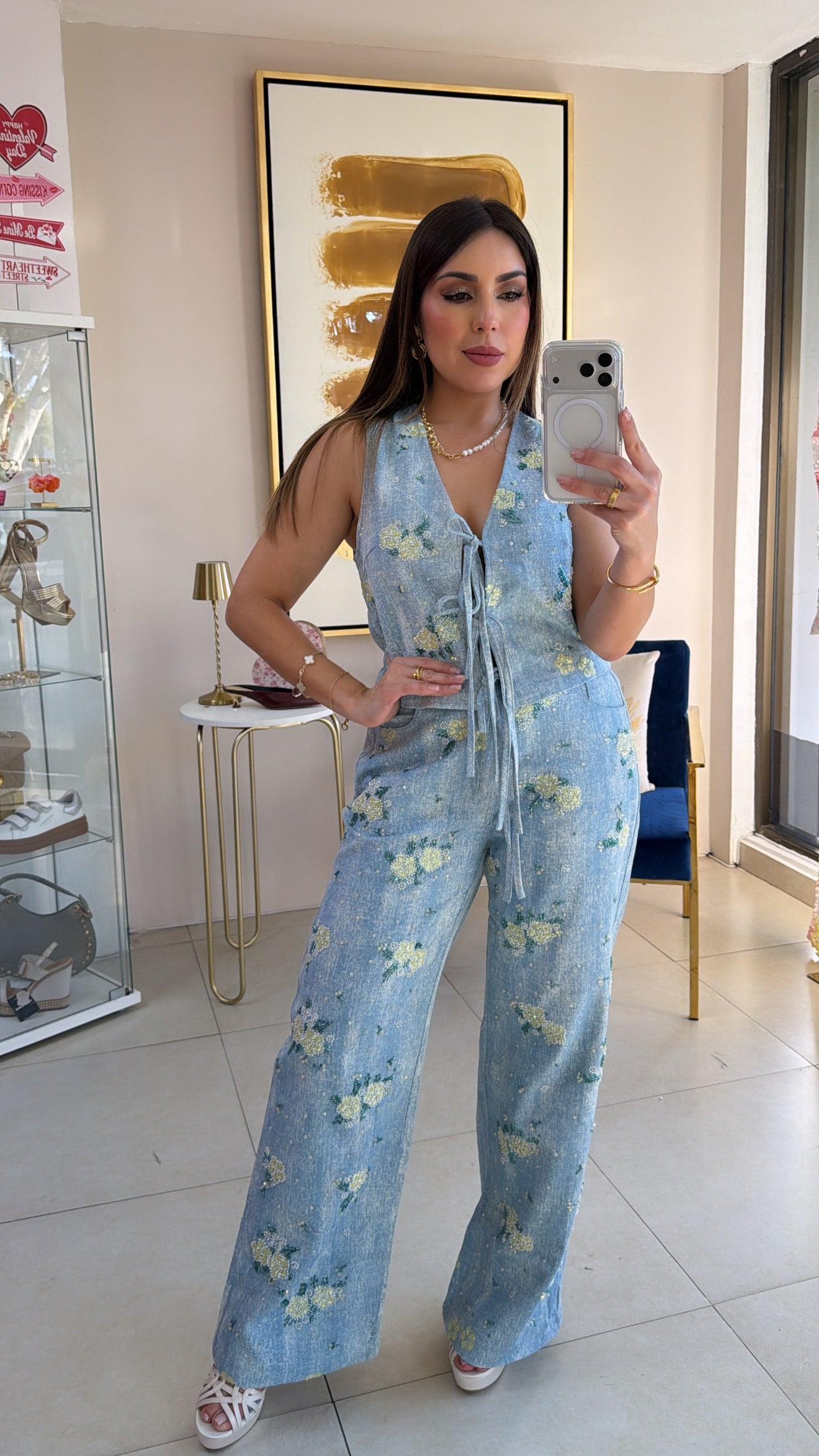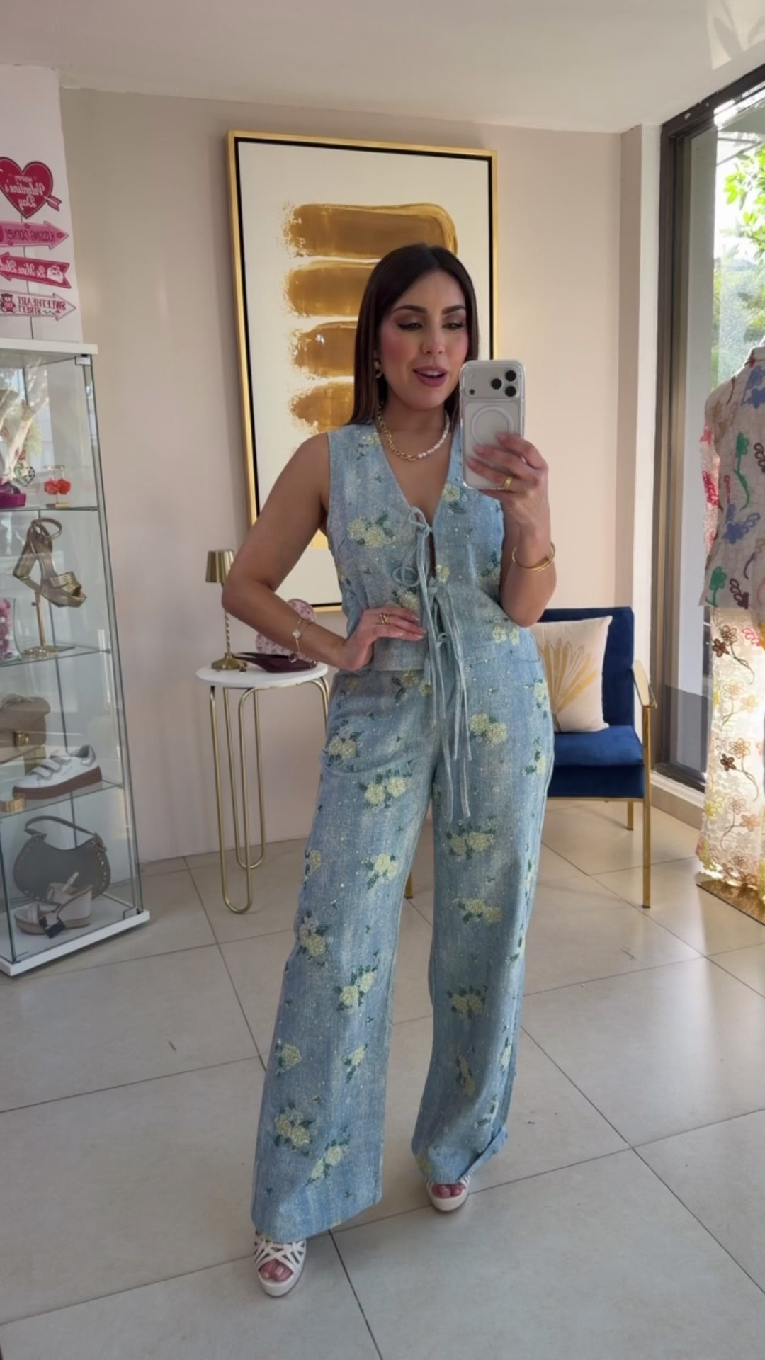 Denim Yellow Flower Vest Set. Model wearing Small.