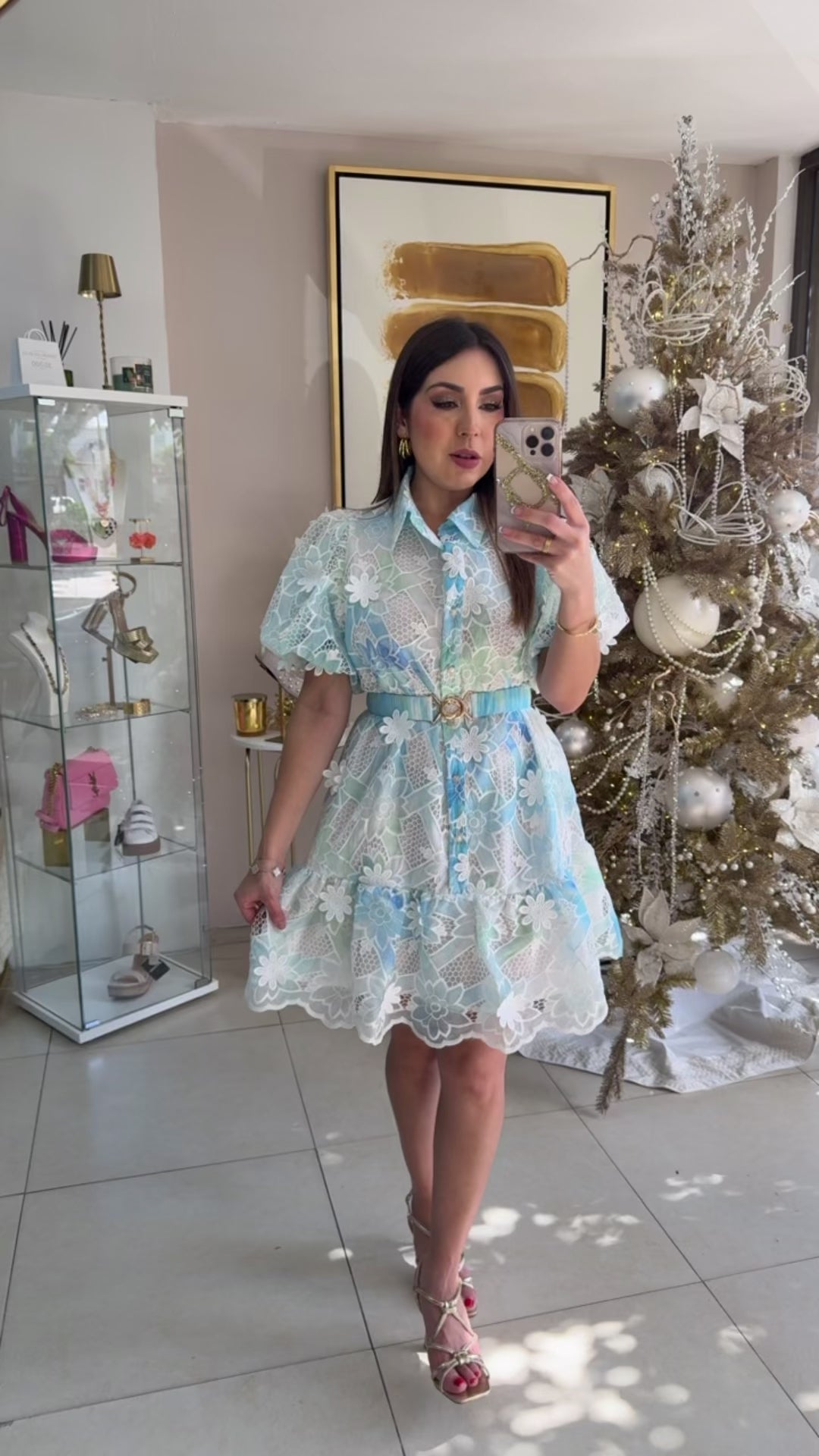 3D Floral Embroidery Dress. Model wearing Small. Belt included.