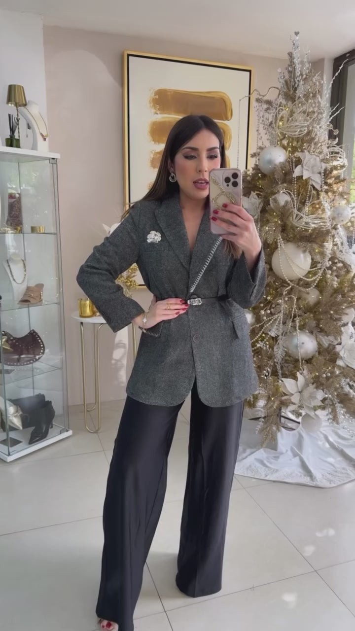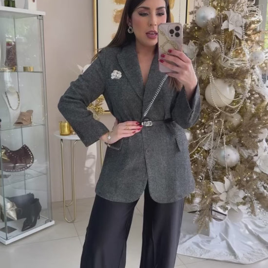 Grey Blazer. Belt included. Model wearing Small/Medium.