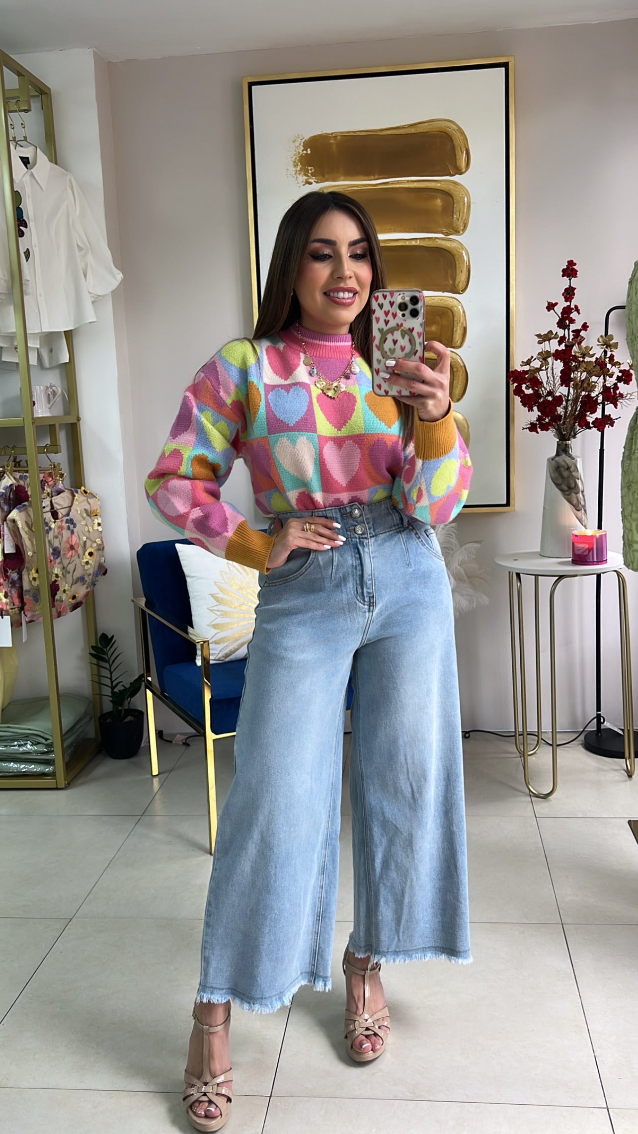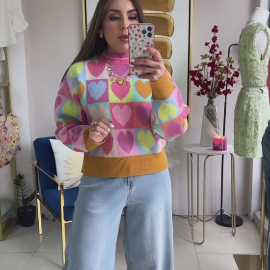 Mock Neck Heart Knit Sweater Top.