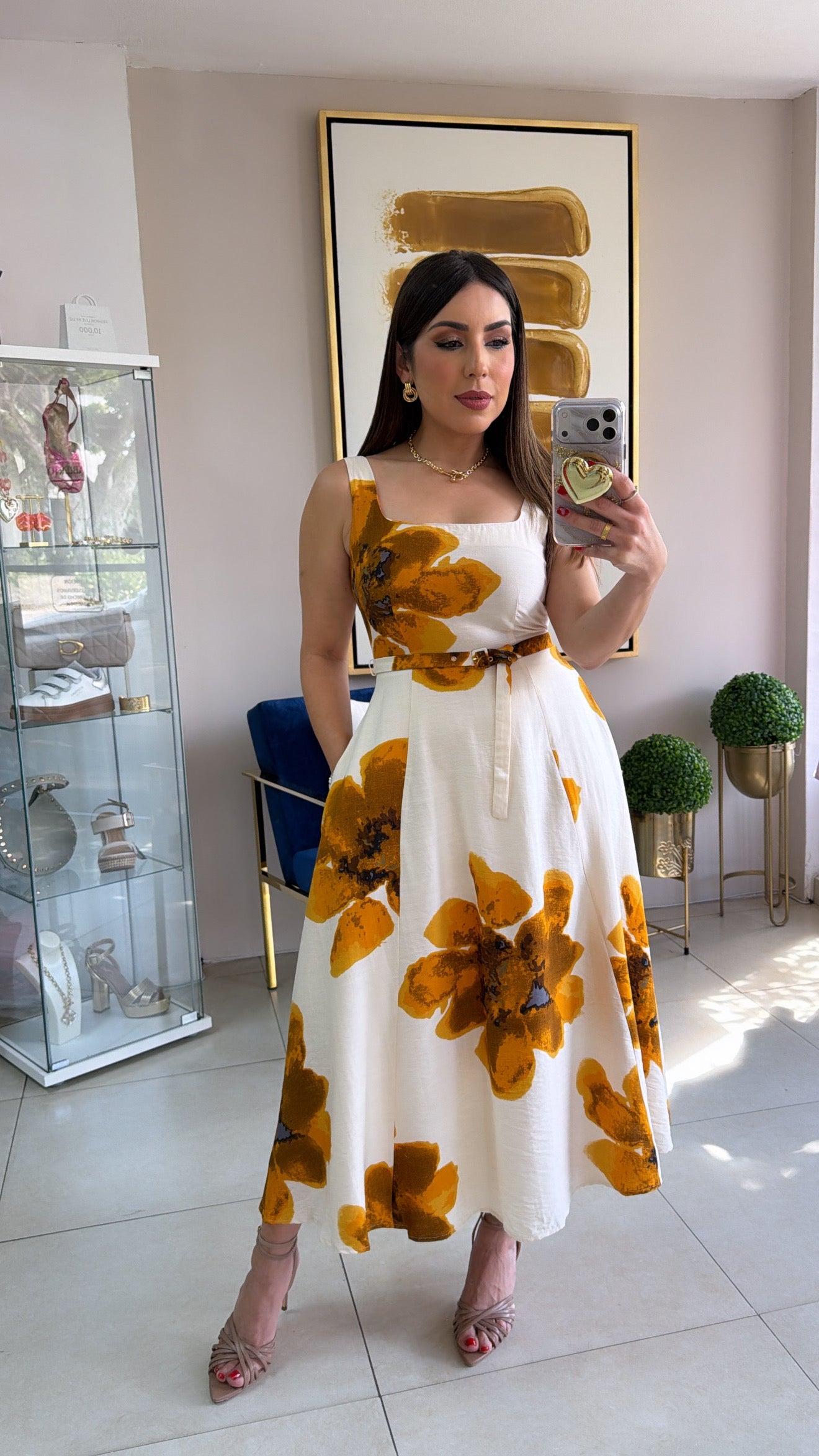 Mustard Floral Midi Dress. Back Zipper. Belt included.