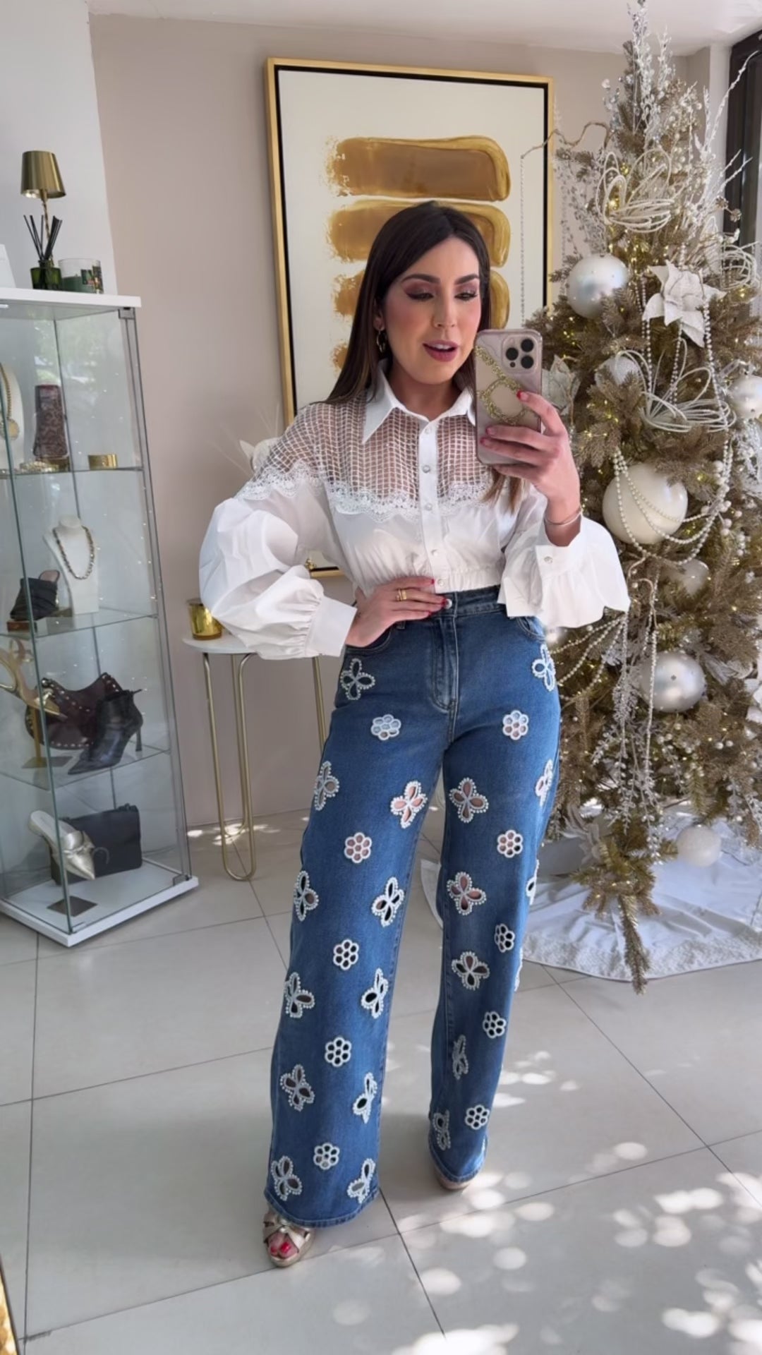 Pearls Flowers Jeans. Model wearing Small.