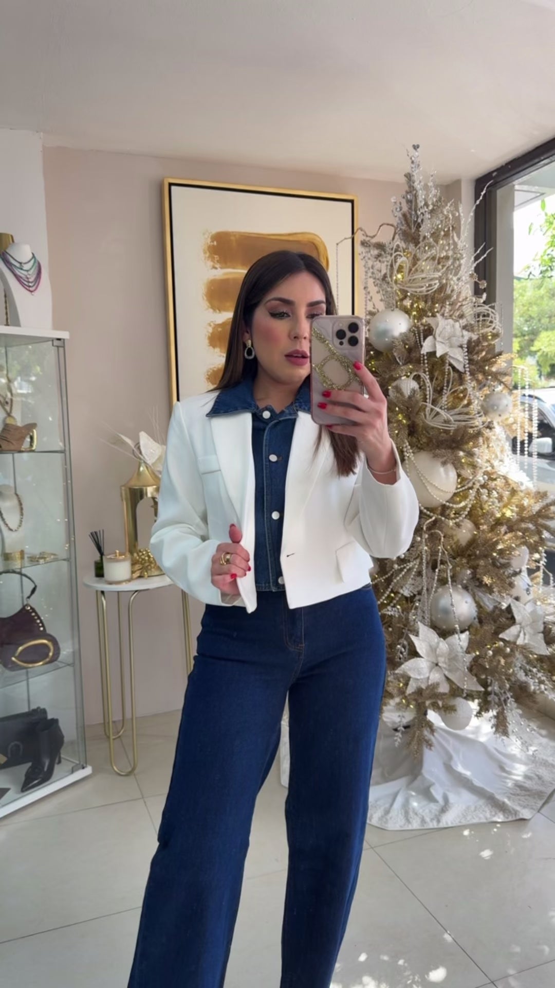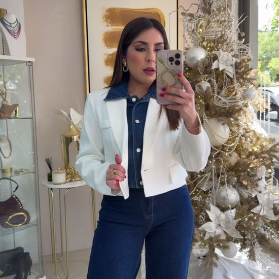 White Denim Blazer Top. Model wearing Small.