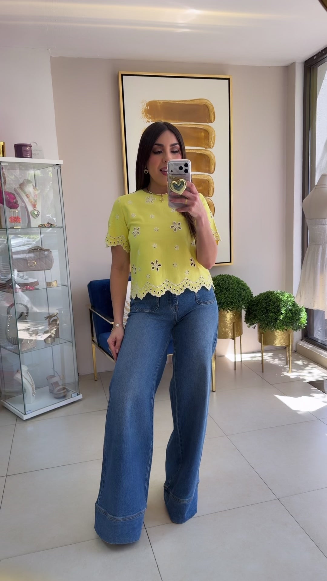 Yellow Embroidery Top. Model wearing small.