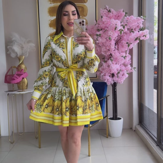 Yellow Floral Short Dress. Belt included.