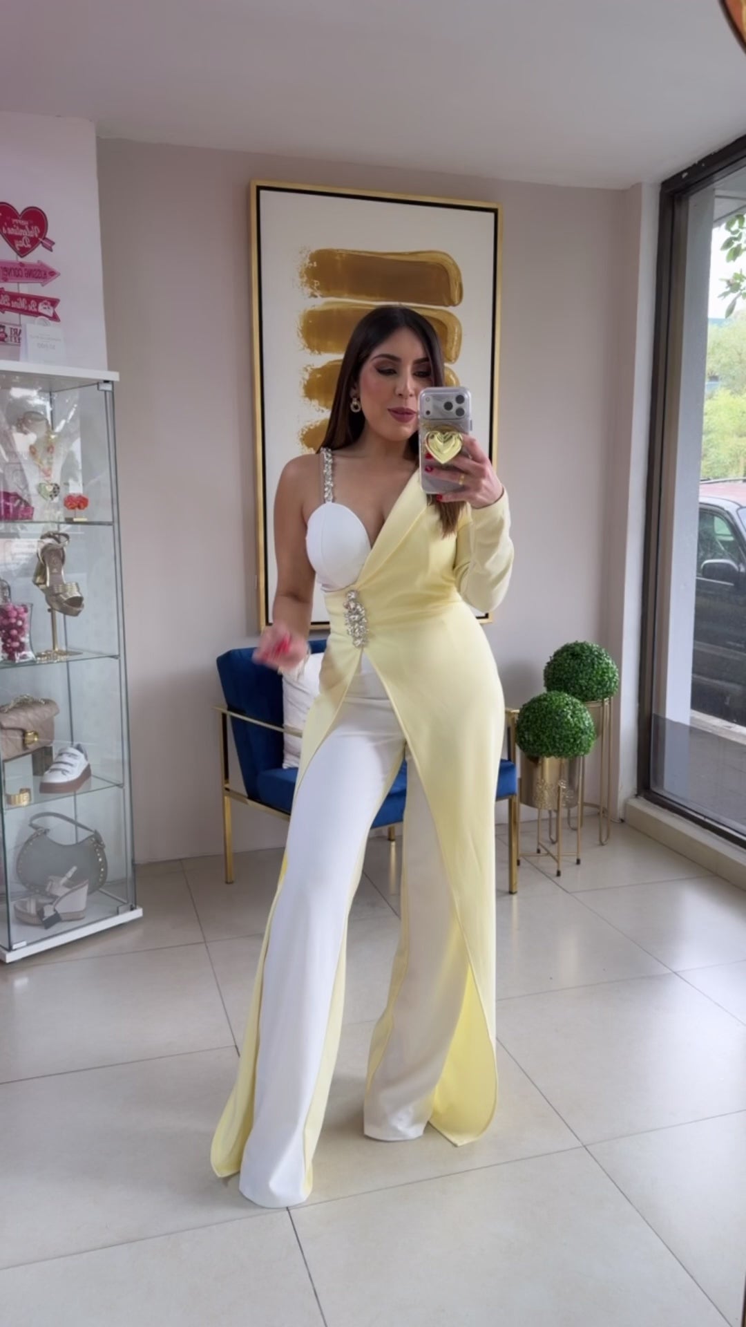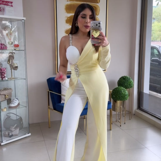 White & Yellow Rhinestones Jumpsuit. Spandex. Back zipper.
